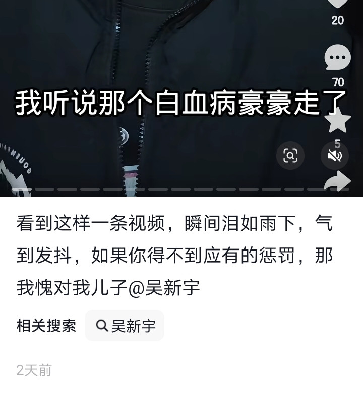 1月30日,“吴新宇”发布道歉视频称:“豪豪对不起,我只是想蹭热度做节目效果,并没有说你,而且不止我一个人说你,有很多人说你。我真的知道错了,我可以给你跪下道歉。”但2月1日,“吴新宇”又发布视频辩解称,他当时说的是另一个因白血病去世的豪豪,“世界上不止一个人叫豪豪,不止一个人得了白血病。”