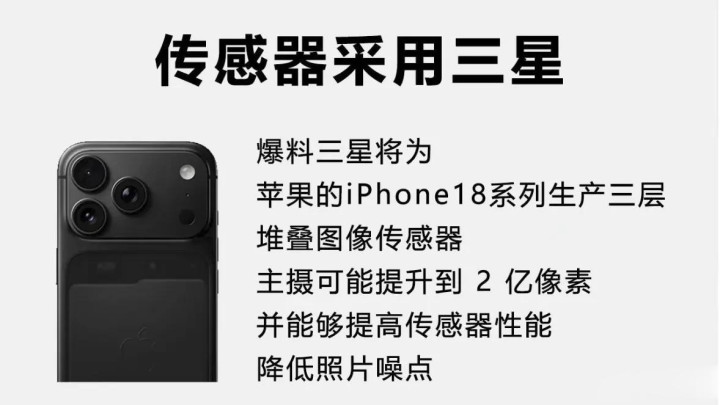 iPhone18系列将切换传感器供应商,采用三星研发的三层堆叠式图像传感器。相比传统传感器,其数据读写速度更快,噪点控制更出色,配合4800万像素主摄,为计算摄影提供更优质的原始素材。