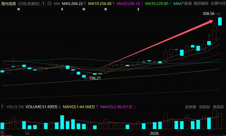 海光信息也是一只趋势性大牛股,2023-2025年分别上涨77%、111%、50%,2026年至今不到一个月已上涨近30%。