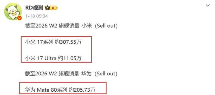 其他博主提供的第三方数据显示,截至2026年第二周,去年下半年发布的国产新旗舰中,销量排名第一的小米17系列,累计销量为318万台左右,是iPhone17系列的约19%。
