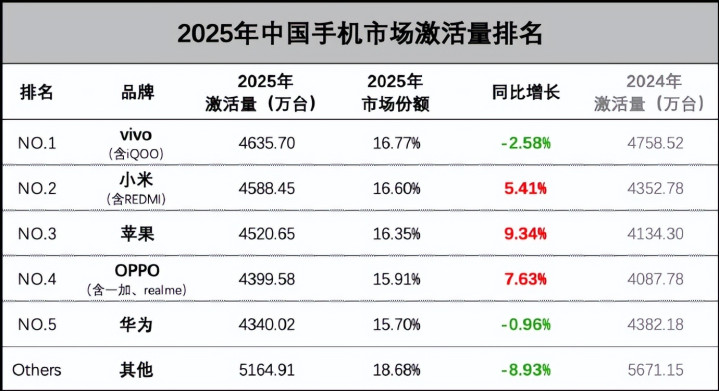 该博主晒出的2025年中国手机市场激活量排名数据显示,苹果以4520万台排名第三。vivo、小米、OPPO、华为分别排名第一、第二、第四和第五,和IDC等市调机构公布的出货量数据有一定的差异。