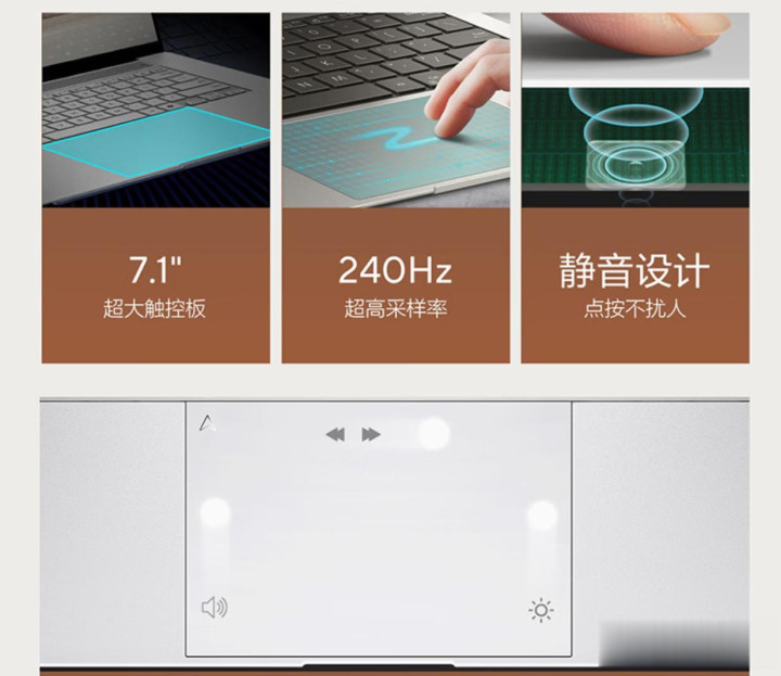 其它周边配置,搭载更大的7.1英寸超感知巨无霸触控板,拥有240Hz超高采样率。更多的快捷手势控制方式,比如沿左右边缘滑动(左侧音量控制,右侧亮度控制);沿顶部边缘滑动(视频时间线控制)等。