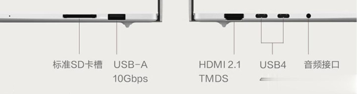 接口与扩展性配置,一个全功能USB-C3.2 Gen2,一个全功能USB 4.0(40Gbps),2个USB-A,HDMI2.1,音频接口。