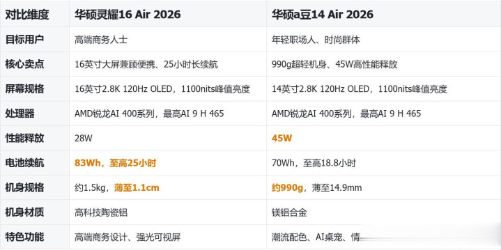 如果你是经常需要出差、参加商务会议的专业人士,对屏幕尺寸、续航时间和机身质感有较高要求,那么灵耀16 Air 2026无疑是更合适的选择。它的16英寸大屏在展示PPT、处理复杂报表时更具优势,25小时的续航能力也能彻底缓解外出时的电量焦虑。
