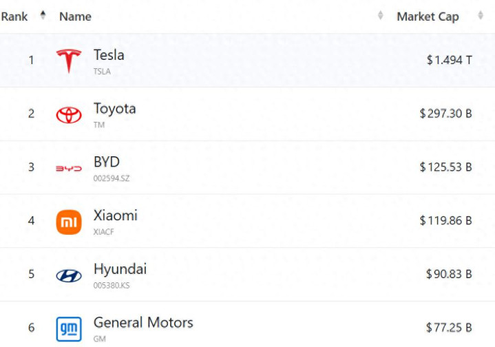 如下图所示,前六名分别是特斯拉、丰田、比亚迪、小米、现代、通用。
