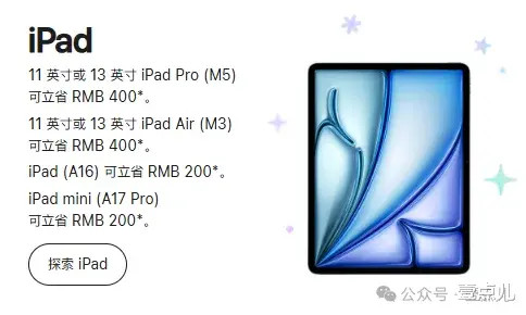 iPad优惠一般,不及每年7月到9月的教育优惠。M5处理器的iPad Pro优惠400元。优惠后售价8599元。M3处理器的iPad Air优惠400元。优惠后售价4399元。入门款iPad优惠200元。优惠后售价2799元。A17 Pro处理器的iPad mini优惠200元。优惠后售价3799元。