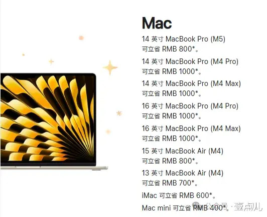 MacBook才是此次活动的重头戏。M5处理器14英寸版本的MacBook Pro也参加活动,优惠800元,优惠后售价12199元起。当前最值得买的机型。优惠力度最大的为M4 Pro处理器和M4 Max处理器的机型。最高为1000元。详细价格就不介绍了,各位朋友可官网查看计算。