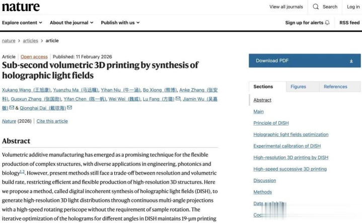 相关后果发表于最新一期《Nature》,论文题为《Sub-second volumetric 3D printing by synthesis of holographic light fields》。这亦然2026年以来第三篇发表于Nature正刊的3D打印参谋后果。