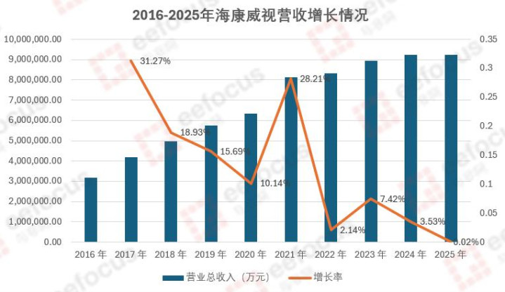 图 | 海康威视营收同比增长率从2017年的31.27%下降至2025年的0.02%;来源:与非网制图