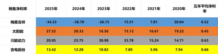 太阳能、川能动力、吉电股份三家的净利率在过去五年均上升。