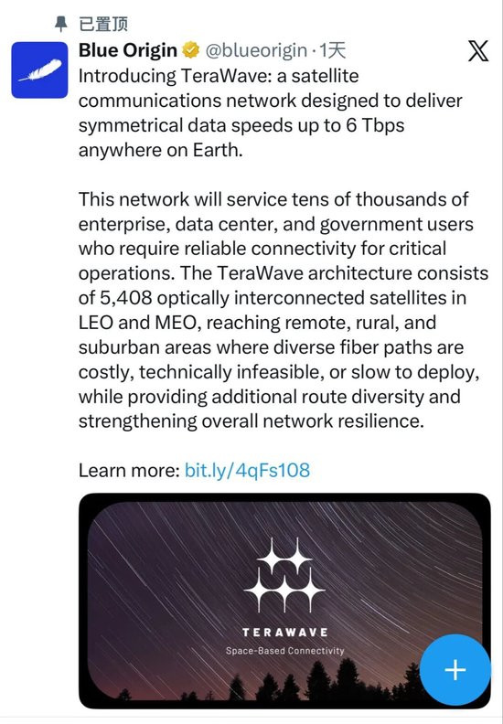 马斯克在社交媒体平台上转发了一则推文,暗示SpaceX将在2027年前推出其第二代蜂窝式“星链”系统。蓝色起源则宣布,将布局由5408颗卫星组成的TeraWave卫星通信网络,服务于企业、数据中心和政府用户,其部署工作将于2027年第四季度开始。