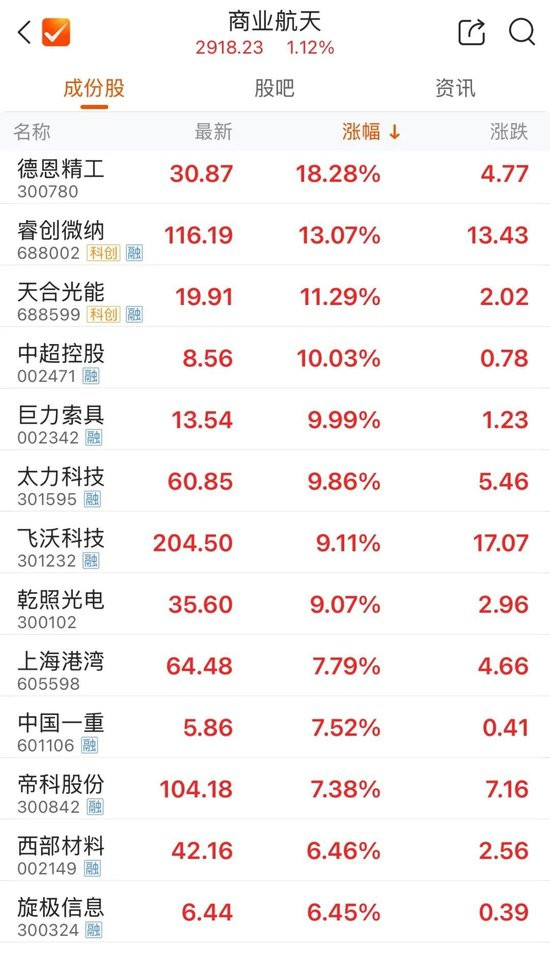 1月23日早盘,商业航天概念延续强势。截至发稿,德恩精工涨超18%,巨力索具3连板,中超控股2连板,飞沃科技、西部材料、旋极信息等跟涨。