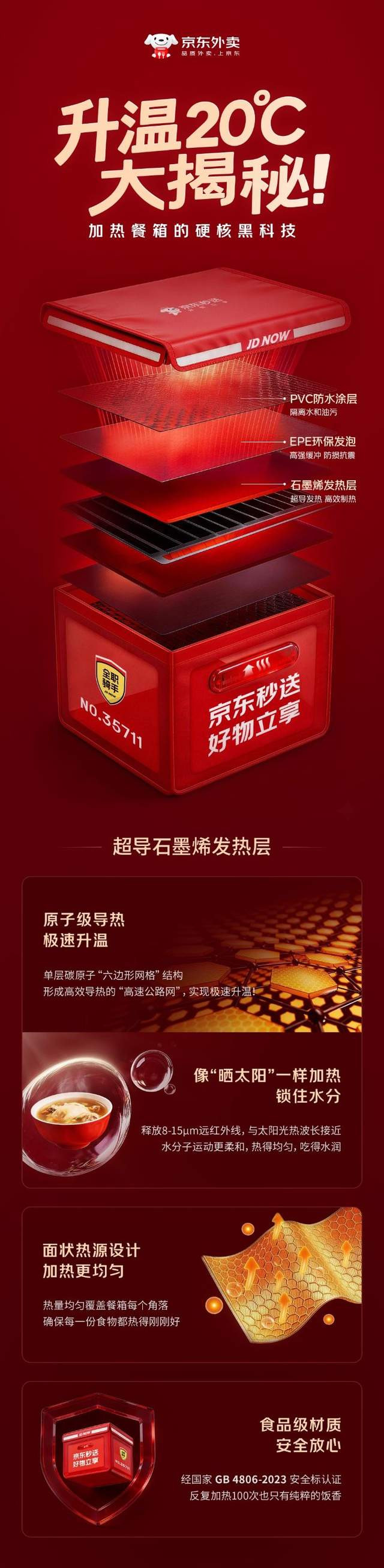 据了解,京东外卖加热餐箱相较普通餐箱,可实现配送温度升温20°C,关键源于其科技配置。餐箱内里的超导石墨烯发热层,在实现极速升温的同时,仍能像“晒太阳”一样柔和加热;不同于传统加热丝,石墨烯发热层的面状热源设计,能让热量均匀覆盖餐箱每个角落,米兰体育确保每一份食物都热得刚刚好;并且,箱体食品级材质均符合国标,保障反复加热后也无异味,只有原汁原味的饭菜香。