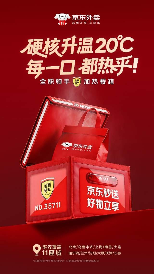 寒潮来袭,全国多地降温明显。近日,京东外卖宣布,加热餐箱服务将于近期扩大覆盖至11座城市,并为全职骑手免费配置。截至目前,北京、上海、乌鲁木齐、南昌4城已上线加热餐箱配送服务,哈尔滨、长春、沈阳等7个寒冷城市也将在1月底前完成覆盖。消费者在上述城市下单京东外卖,将优先匹配加热餐箱骑手,还能在订单配送页查看对应服务。