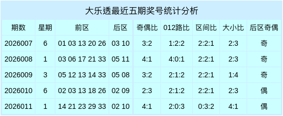 三区分析: 上期前区三区比为0:3:2,2区号码走热;近5期前区三区比为8:11:6,2区号码热出。本期预计1区表现突出,关注三区比3:1:1。