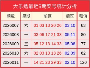 开奖回顾:大乐透2026011开奖号码为14、21、23、29、33+02、10。其中大小比为4:1,和值为120。