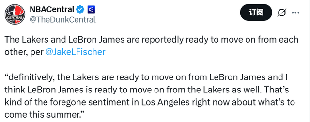 北京时间2月3日,据名记Fischer报道,湖人已经准备好与勒布朗-詹姆斯分道扬镳,詹姆斯也准备好离开湖人队了。这几乎是目前洛杉矶对于今年夏天即将发生的事情的普遍看法。