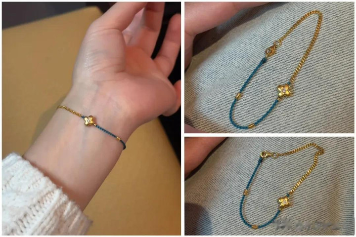 年年月月花千岁:diy做了一条小克重的黄金手链!一半雾霾蓝色手绳跟一半古巴足金链,中间再搭配一个镶钻的四叶草小花,色彩鲜明,款式设计简约却不简单,上手显白又清新,小克重,日常百搭。