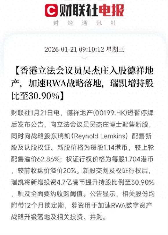 1.70 港元的行权价、一年禁售承诺,这两个细节直接暴露了瑞凯的野心 —— 它要的不是短期股价波动的利差,而是德祥地产转型后的绝对话语权。说白了,这是一场用高成本换时间、换确定性的资本豪赌,赌的就是 RWA 赛道爆发后,这家公司的价值重估。要知道,在港股玩壳重组,最值钱的从来不是壳本身,而是壳背后的资源整合能力和赛道想象力。