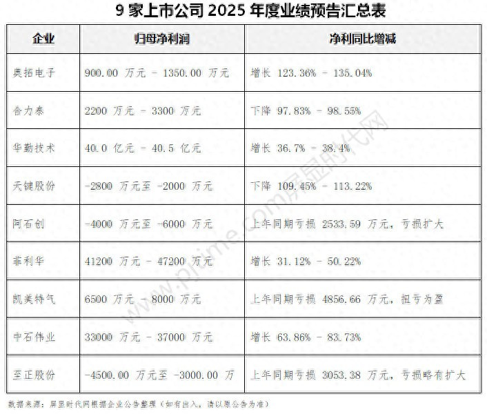 近日,奥拓电子、合力泰、华勤技术、天键股份、阿石创、菲利华、凯美特气、中石伟业、至正股份九家分属 LED 显示屏、电子纸、智能制造、半导体与显示材料等领域的上市企业陆续披露2025年度业绩预告。