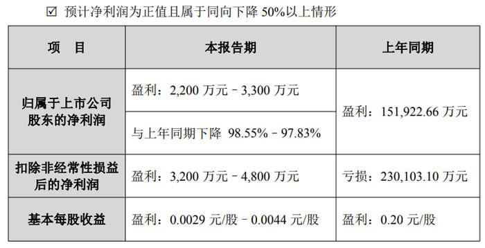归属于上市公司股东的净利润预计为 2200 万元 - 3300 万元,上年同期则为盈利 151922.66 万元,同比下降 97.83%-98.55%;扣除非经常性损益后的净利润预计为 3200 万元 - 4800 万元,上年同期为亏损 230103.10 万元,实现扭亏为盈;基本每股收益预计为 0.0029 元 / 股 - 0.0044 元 / 股,上年同期为 0.20 元 / 股。