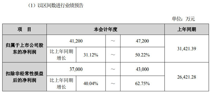 报告期内,公司归属于上市公司股东的净利润预计为 41200 万元至 47200 万元,较上年同期的 31421.39 万元增长 31.12% 至 50.22%;扣除非经常性损益后的净利润预计为 37000 万元至 43000 万元,较上年同期的 26421.28 万元增长 40.04% 至 62.75%,盈利能力稳步提升。