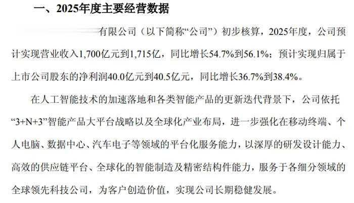 2026 年 1 月 22 日,华勤技术股份有限公司(证券代码:603296,证券简称:华勤技术)发布《2025 年度主要经营数据的公告》。经初步核算,华勤技术 2025 年度经营业绩实现显著增长。公司预计实现营业收入区间为 1700 亿元至 1715 亿元,同比增幅达 54.7%至 56.1%;预计实现归属于上市公司股东的净利润 40.0 亿元至 40.5 亿元,同比增长 36.7% 至 38.4%,营收与净利均呈现稳健攀升态势。