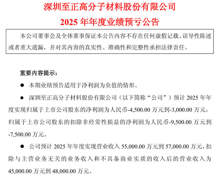 深圳至正高分子材料股份有限公司归母净利润预计为人民币 - 4500.00 万元至 - 3000.00 万元,较上年同期继续亏损;扣非净利润预计为人民币 - 9500.00 万元至 - 7500.00 万元;营业收入预计实现 55000.00 万元至 57000.00 万元,其中扣除与主营业务无关的业务收入和不具备商业实质的收入后的营业收入为 45000.00 万元至 48000.00 万元。