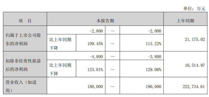 天键电声股份有限公司归母净利润本报告期预计为 - 2800 万元至 - 2000 万元,上年同期为 21175.02 万元,同比下降 109.45%~113.22%;扣除非经常性损益后的净利润本报告期预计为 - 4800 万元至 - 3800 万元,上年同期为 16514.97 万元,同比下降 123.01%~129.06%。