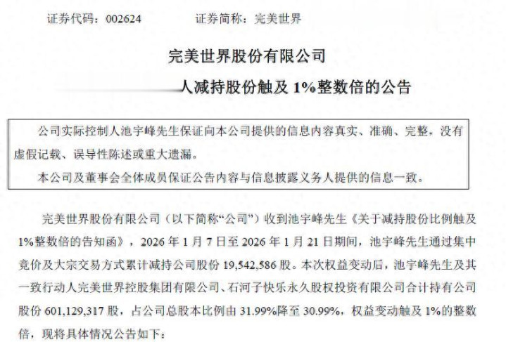 2026年1月21日,完美世界公告实际控制人减持股份触及1%整数倍。1月7日至1月21日期间,池宇峰通过集中竞价及大宗交易方式累计减持公司股份19,542,586股。本次权益变动后,池宇峰及其一致行动人合计持有公司股份601,129,317股,占公司总股本比例由31.99%降至30.99%。