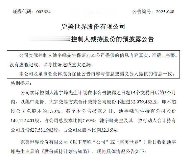 2025年11月27日,完美世界发布《关于公司实际控制人减持股份的预披露公告》,披露实际控制人池宇峰的股份减持计划。根据公告,池宇峰计划在公告披露之日起15个交易日后的3个月内,通过集中竞价或大宗交易方式减持公司股份不超过32,979,462股,不超过公司总股本的1.70%。减持原因表述为“自身资金需要”。