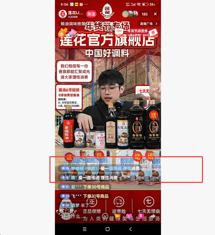 22号早上8点,中国食品安全网进入到莲花味精在抖音、视频号不同平台的不同直播间,看到直播间“理性消费”的留言频繁闪现,这让人不禁想起2021年鸿星尔克在净利润亏损2.2亿元的情况下,毅然向河南灾区捐款5000万元,引发网友“野性消费”,公司总裁吴荣照不得不在直播间连用四个“理性”呼吁消费者冷静下单的场景。