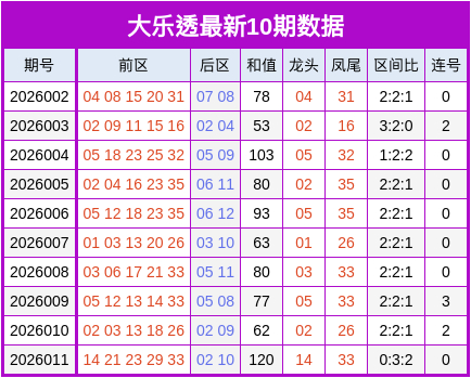 三区分析:近10期前三区比为18:21:11,近5期前三区比为8:11:6,上期前区三区比为0:3:2,本期推荐三区比为2:2:1。