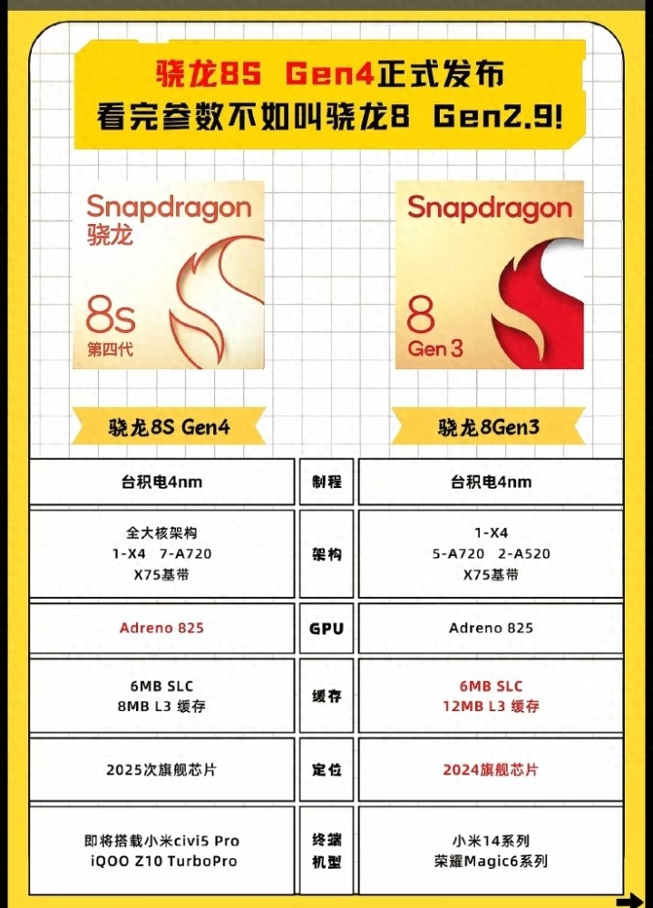 1:在智能手机芯片竞争白热化的2024年,高通再次向市场抛出了一枚重磅炸弹,骁龙8s Gen4正式发布,这款被寄予厚望的“次旗舰”芯片,从曝光之初就备受瞩目。然而,当详细的参数对比图展现在我们面前时,不少科技爱好者和行业观察员纷纷发出了一个颇具调侃意味的评论,看完参数对比还不如叫骁龙8 Gen2.9,这一略带戏谑的称呼,恰恰道出了这款芯片最核心的特质,它并非一次颠覆性的革命,而是一次精雕细琢的极致改良。