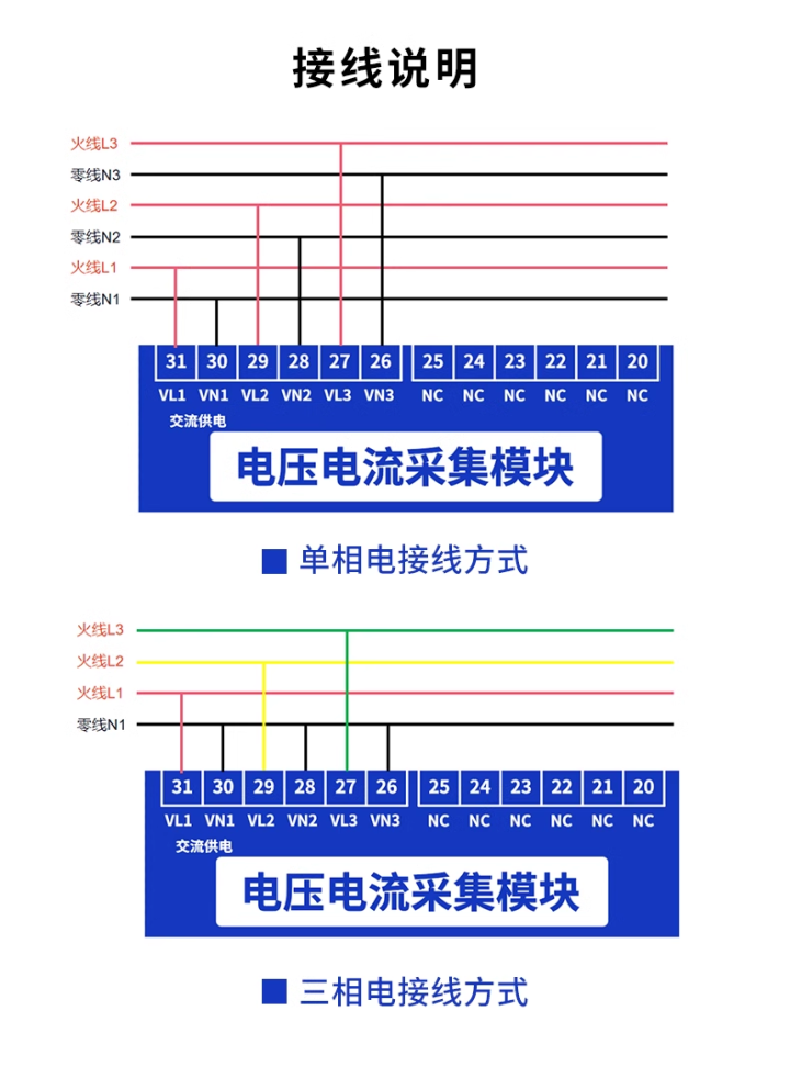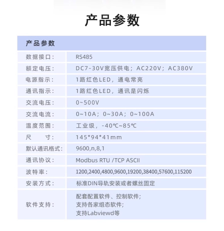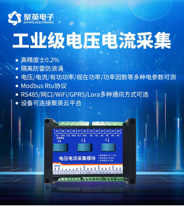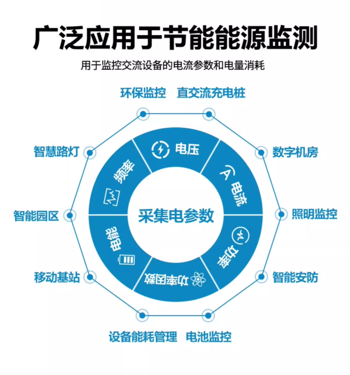 基于电参数采集模块的交流设备电流及电量监测方案,其核心在于精准采集、可靠传输、智能分析。方案通过电参数采集模块(单相/三相)实时采集交流设备的电压、电流、功率、功率因数、频率等关键参数,并通过通信接口将数据传输至网关或云端平台,实现对设备运行状态的实时监控、用电量统计、能耗分析和异常报警。