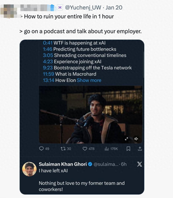 但就在最近,一个名叫 Sulaiman Ghori 的 xAI 工程师,在播客里侃侃而谈了一个多小时,把自己在公司的所见所闻全抖了出来。结果:播客上线第3天,他就被火速解雇了。