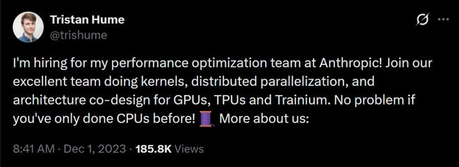 为此,Anthropic公司绩效优化团队负责人TristanHume在Twitter上发帖求贤,虽然收到了大量简历,但标准的面试流程太耗时了。