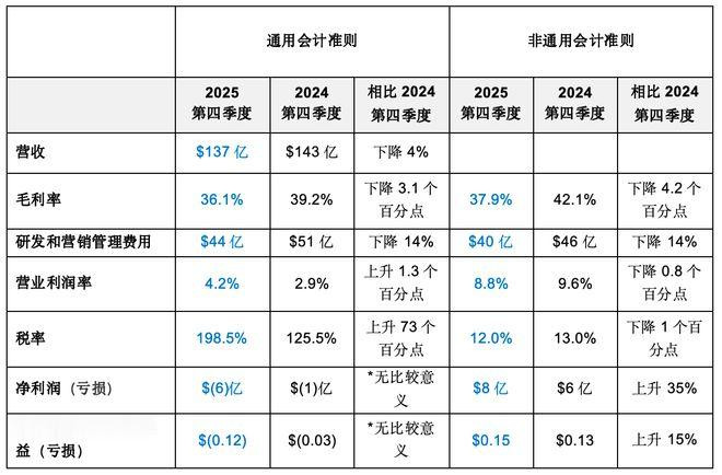 英特尔第四季度每股收益(EPS)为-0.12美元;非通用会计准则(Non-GAAP)每股收益为0.15美元。全年每股收益为-0.06美元;非通用会计准则每股收益为0.42美元。