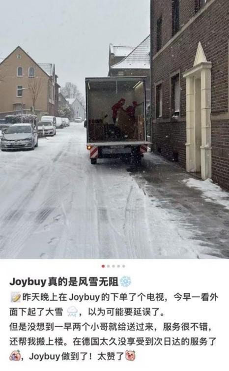 德国、法国等地的网友也纷纷分享类似的购物体验。一位在德国生活的网友发帖分享称,尽管当地出现降雪天气,自己前一天晚上9点在Joybuy上下单的电视依然在第二天一早就送货上门,米兰体育官网“在德国太久没有享受到次日达的服务了,Joybuy做到了”,并表示快递小哥“服务很不错”,还帮忙搬上楼。